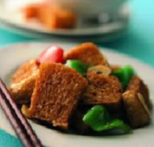 2)將鍋預熱後,放入少許油及蒜片爆香後,再放入調味料煮沸。放入烤麩後改中火煮到湯汁收乾入味(如果烤麩還很硬的話,可以再加入1/2杯水繼續煮),然後放入紅、青椒片略炒至熟後,即可盛起食用。
